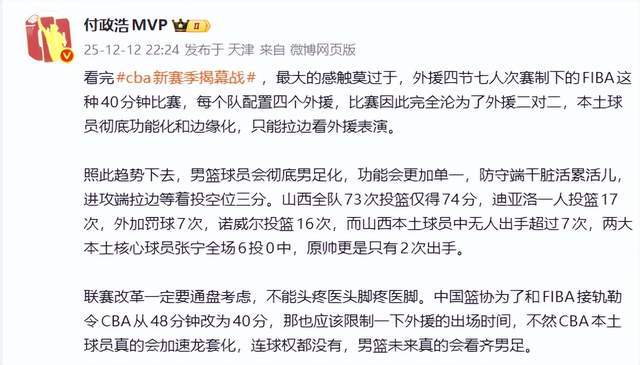 这样的结果,显然不是我们想要的,以至于媒体人付政浩老师都忍不住了,“看完cba新赛季揭幕战,最大的感触莫过于,外援四节七人次赛制下的FIBA这种40分钟比赛,每个队配置四个外援,比赛因此完全沦为了外援二对二,本土球员彻底功能化和边缘化,只能拉边看外援表演。”